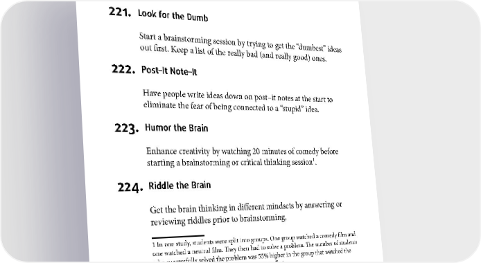 BRAINSTORMING 221. Look for the Dumb Start a brainstorming session by trying to get the “dumbest” ideas out first. Keep a list of the really bad (and really good) ones. 222. Post–It Note–It Have people write ideas down on post–it notes at the start to eliminate the fear of being connected to a “stupid” idea. 223. Humor the Brain Enhance creativity by watching 20 minutes of comedy before 1 starting a brainstorming or critical thinking session . 224. Riddle the Brain Get the brain thinking in different mindsets by answering or reviewing riddles prior to brainstorming. 1 In one study, students were split into groups. One group watched a comedy film and one watched a neutral film. They then had to solve a problem. The number of students who successfully solved the problem was 55% higher in the group that watched the comedy film than the neutral one. See Positive affect. 120