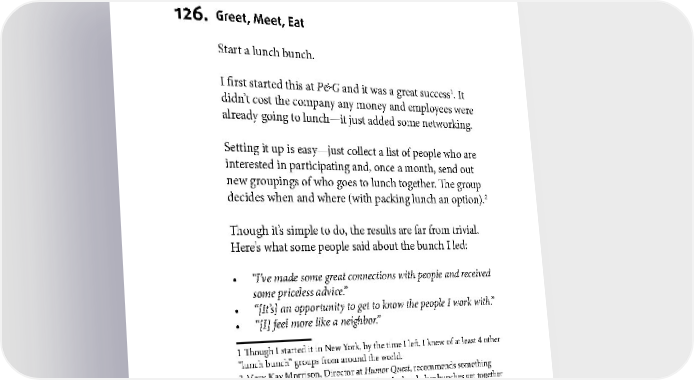 NETWORKING 126. Greet, Meet, Eat Start a lunch bunch. 1 I first started this at P&G and it was a great success . It didn’t cost the company any money and employees were already going to lunch—it just added some networking. Setting it up is easy—just collect a list of people who are interested in participating and, once a month, send out new groupings of who goes to lunch together. The group decides when and where (with packing lunch an option).2 Though it’s simple to do, the results are far from trivial. Here’s what some people said about the bunch I led: • “I’ve made some great connections with people and received some priceless advice.” • “[It’s] an opportunity to get to know the people I work with.” • “[I] feel more like a neighbor.” 1 Though I started it in New York, by the time I left, I knew of at least 4 other “lunch bunch” groups from around the world. 2 Mary Kay Morrison, Director at Humor Quest, recommends something similar, except instead of getting together for lunch, her bunches get together for a fun activity. Find out more about Mary Kay at www.humorquest.com. 74