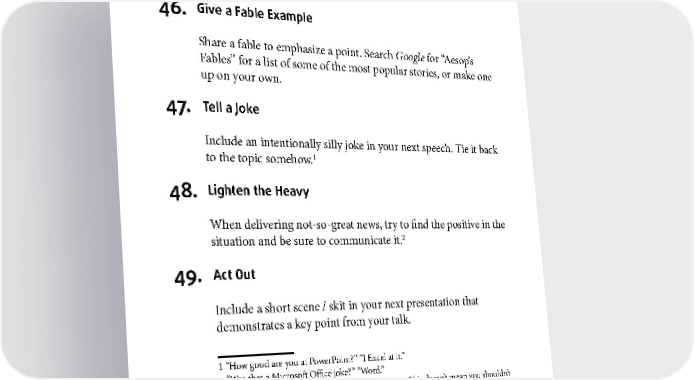 PRESENTATIONS 46. Give a Fable Example Share a fable to emphasize a point. Search Google for “Aesop’s Fables” for a list of some of the most popular stories, or make one up on your own. 47. Tell a Joke Include an intentionally silly joke in your next speech. Tie it back to the topic somehow.1 48. Lighten the Heavy When delivering not-so-great news, try to find the positive in the situation and be sure to communicate it.2 49. Act Out Include a short scene / skit in your next presentation that demonstrates a key point from your talk. 1 “How good are you at PowerPoint?” “I Excel at it.” “Was that a Microsoft Office joke?” “Word.” 2 Hat tip to Angela Mohns for the suggestion. Note: This doesn’t mean you shouldn’t take the matter seriously, just don’t confuse “seriousness” with “somberness.” 36