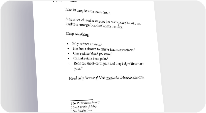 STRESS RELIEVER 440. Breathe Take 10 deep breaths every hour. A number of studies suggest just taking deep breaths can lead to a smorgasboard of health benefits. Deep breathing: 1 • May reduce anxiety. 2 • Has been shown to relieve trauma symptoms. 3 • Can reduce blood pressure. 4 • Can alleviate back pain. • Reduces short–term pain and may help with chronic 5 pain. Need help focusing? Visit www.take10deepbreaths.com. 1 See Performance Anxiety. 2 See A Breath of Relief. 3 See Breathe Deep. 4 See Deep Breathing for Back Pain. 5 See Breathing Deeply. 223
