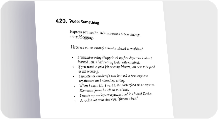 STRESS RELIEVER 420. Tweet Something Express yourself in 140 characters or less through microblogging. 1 Here are some example tweets related to working: • I remember being disappointed my first day at work when I learned 1on1s had nothing to do with basketball. • If you want to get a job catching lobsters, you have to be good at net working. • I sometimes wonder if I was destined to be a telephone repairman but I missed my calling. • When I was a kid, I went to the doctor for a cut on my arm. He was so funny he left me in stitches. • I made my workspace a puzzle. I call it a Rubik’s Cubicle. • A rookie cop who also raps: “give me a beat.” 1 From the book #drewtarvintweets available at htww.co/tweets. 215