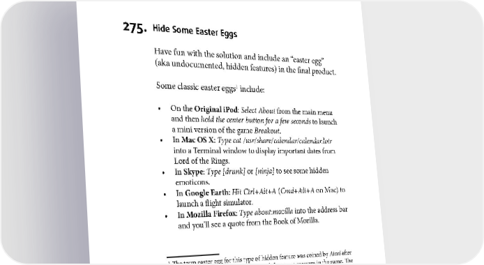 IMPLEMENTATION 275. Hide Some Easter Eggs Have fun with the solution and include an “easter egg” (aka undocumented, hidden features) in the final product. 1 Some classic easter eggs include: • On the Original iPod: Select About from the main menu and then hold the center button for a few seconds to launch a mini version of the game Breakout. • In Mac OS X: Type cat /usr/share/calendar/calendar.lotr into a Terminal window to display important dates from Lord of the Rings. • In Skype: Type [drunk] or [ninja] to see some hidden emoticons. • In Google Earth: Hit Ctrl+Alt+A (Cmd+Alt+A on Mac) to launch a flight simulator. • In Mozilla Firefox: Type about:mozilla into the address bar and you’ll see a quote from the Book of Mozilla. 1 The term easter egg for this type of hidden feature was coined by Atari after the programmer of the game Adventure left a secret message in the game. The message? “Created by Warren Robinett.” 143