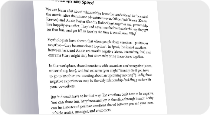 RELATIONSHIPS Relationships and Speed We can learn a lot about relationships from the movie Speed. At the end of the movie, after the intense adventure is over, Officer Jack Traven (Keanu Reeves) and Annie Porter (Sandra Bullock) get together and, presumably, live happily ever after. They had never met before that fateful day they got on that bus, and yet fell in love by the time it was all over. Why? Psychologists have shown that when people share emotions—positive or 1 negative—they become closer together . In Speed, the shared emotions between Jack and Annie are mostly negative (stress, uncertainty, fear) and extreme (they might die), but ultimately bring them closer together. In the workplace, shared emotions with coworkers can be negative (stress, uncertainty, fear), and feel extreme (you might “literally die if you have 2 to go to another pre-meeting about an upcoming meeting” ). Sadly, those negative experiences may be the only relationship–building you do with your coworkers. But it doesn’t have to be that way. The emotions don’t have to be negative. You can share fun, happiness and joy in the office through humor. Levity can be a source of positive emotions shared between you and your team, cubicle mates, manager, and customers. 1 See Let the Good Times Roll. 2 I heard a coworker say this once. She did go to another pre–meeting but luckily she did not die. 60