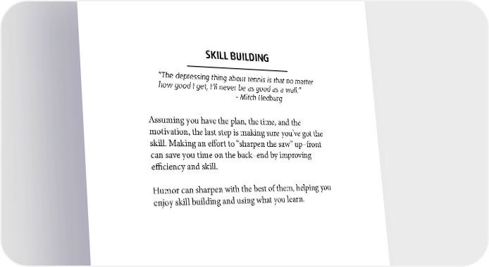 SKILL BUILDING “The depressing thing about tennis is that no matter how good I get, I’ll never be as good as a wall.” - Mitch Hedburg Assuming you have the plan, the time, and the motivation, the last step is making sure you’ve got the skill. Making an effort to “sharpen the saw” up–front can save you time on the back–end by improving efficiency and skill. Humor can sharpen with the best of them, helping you enjoy skill building and using what you learn. 176
