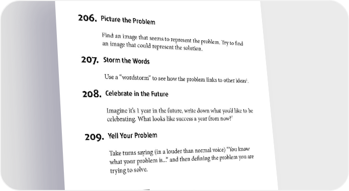 PROBLEM DEFINITION 206. Picture the Problem Find an image that seems to represent the problem. Try to find an image that could represent the solution. 207. Storm the Words 1 Use a “wordstorm” to see how the problem links to other ideas . 208. Celebrate in the Future Imagine it’s 1 year in the future, write down what you’d like to be 2 celebrating. What looks like success a year from now? 209. Yell Your Problem Take turns saying (in a louder than normal voice) “You know what your problem is...” and then defining the problem you are trying to solve. 1 Go to htww.co/wordstorm to find out more. 2 For example, a year from now, I’d like to be a year older. Fingers crossed. 113