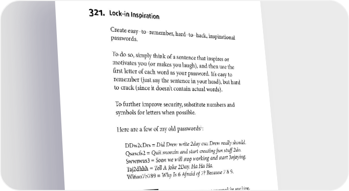 MOTIVATION 321. Lock–in Inspiration Create easy–to–remember, hard–to–hack, inspirational passwords. To do so, simply think of a sentence that inspires or motivates you (or makes you laugh), and then use the first letter of each word as your password. It’s easy to remember (just say the sentence in your head), but hard to crack (since it doesn’t contain actual words). To further improve security, substitute numbers and symbols for letters when possible. 1 Here are a few of my old passwords : DDw2cDrs = Did Drew write 2day cuz Drew really should. Qsascfs2 = Quit snoozin and start creating fun stuff 2do. Swwswas3 = Soon we will stop working and start 3njoying. Taj2dhhh = Tell A Joke 2Day. Ha Ha Ha. Wi6ao7b789 = Why Is 6 Afraid of 7? Because 7 8 9. 1 Note to the hackers: none of these are my current password for anything. Except maybe my MySpace page. 168
