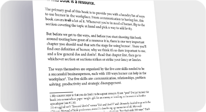 AN INTRODUCTION #2. This book is a resource. The primary goal of this book is to provide you with a laundry list of ways to use humor in the workplace. From communication to having fun, this book covers it all a lot of it. Whenever you’re in need of humor, flip to the section covering the topic at hand and pick a way to add levity. But before we get to the ways, and before you start showing this book around touting how great of a resource it is, there is one very important chapter you should read that sets the stage for using humor1. There you’ll find our definition of humor, why we think it’s so darn important to use, 2 and a few general dos and don’ts . Read that chapter first, then go to whichever section or sections strikes or strike your fancy or fancies. The ways themselves are organized by the five core skills needed to be a successful businessperson, each with 100 ways humor can help in the workplace3. The five skills are: communication, relationships, problem solving, productivity and strategic disengagement. 1 My sincere hope is that you do find it to be a great resource. If not, *poof* I’ve just turned this book into a marvelous paper weight, gift for an enemy, or kindling in the event of a Zombie apocalypse (see #116). 2 I struggled with “dos and don’ts” versus “do’s and don’t’s” and ultimately decided to go with the Chicago Manual of Style preference, even if it does bring up memories of old Microsoft. 3 The mathematicians among you are stopping here, thinking, “but that’s only 500 ways.” That’s correct, the last way is presented in the final chapter. iii