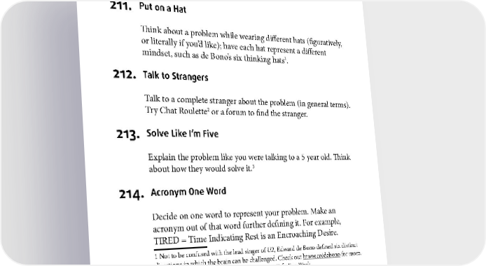 PROBLEM DEFINITION 211. Put on a Hat Think about a problem while wearing different hats (figuratively, or literally if you’d like); have each hat represent a different mindset, such as de Bono’s six thinking hats1. 212. Talk to Strangers Talk to a complete stranger about the problem (in general terms). Try Chat Roulette2 or a forum to find the stranger. 213. Solve Like I’m Five Explain the problem like you were talking to a 5 year old. Think about how they would solve it.3 214. Acronym One Word Decide on one word to represent your problem. Make an acronym out of that word further defining it. For example, TIRED = Time Indicating Rest is an Encroaching Desire. 1 Not to be confused with the lead singer of U2, Edward de Bono defined six distinct directions in which the brain can be challenged. Check out htww.co/debono for more. 2 Be very careful as Chat Roulette is not always Safe-For-Work. 3 See #51 for more information. 115