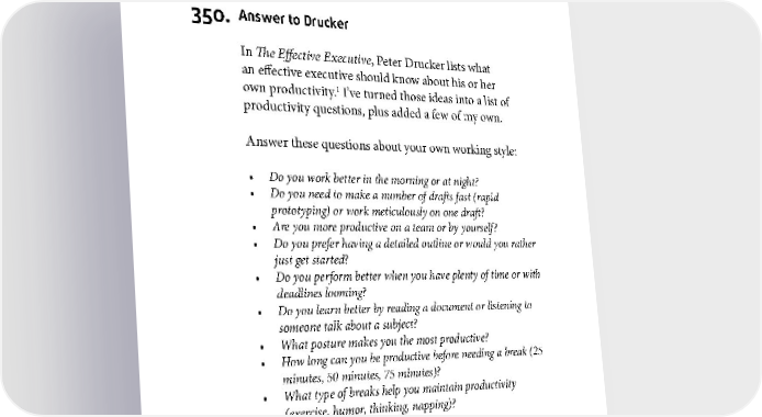 SKILL BUILDING 350. Answer to Drucker In The Effective Executive, Peter Drucker lists what an effective executive should know about his or her own productivity.1 I’ve turned those ideas into a list of productivity questions, plus added a few of my own. Answer these questions about your own working style: • Do you work better in the morning or at night? • Do you need to make a number of drafts fast (rapid prototyping) or work meticulously on one draft? • Are you more productive on a team or by yourself? • Do you prefer having a detailed outline or would you rather just get started? • Do you perform better when you have plenty of time or with deadlines looming? • Do you learn better by reading a document or listening to someone talk about a subject? • What posture makes you the most productive? • How long can you be productive before needing a break (25 minutes, 50 minutes, 75 minutes)? • What type of breaks help you maintain productivity (exercise, humor, thinking, napping)? 1 See The Effective Executive. 180