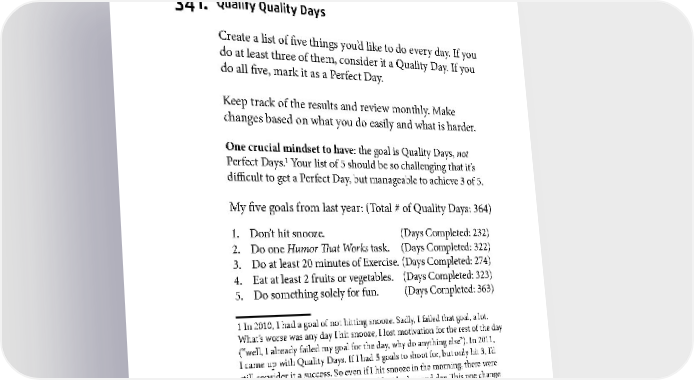 SKILL BUILDING 341. Qualify Quality Days Create a list of five things you’d like to do every day. If you do at least three of them, consider it a Quality Day. If you do all five, mark it as a Perfect Day. Keep track of the results and review monthly. Make changes based on what you do easily and what is harder. One crucial mindset to have: the goal is Quality Days, not 1 Perfect Days. Your list of 5 should be so challenging that it’s difficult to get a Perfect Day, but manageable to achieve 3 of 5. My five goals from last year: (Total # of Quality Days: 364) 1. Don’t hit snooze. (Days Completed: 232) 2. Do one Humor That Works task. (Days Completed: 322) 3. Do at least 20 minutes of Exercise. (Days Completed: 274) 4. Eat at least 2 fruits or vegetables. (Days Completed: 323) 5. Do something solely for fun. (Days Completed: 363) 1 In 2010, I had a goal of not hitting snooze. Sadly, I failed that goal, a lot. What’s worse was any day I hit snooze, I lost motivation for the rest of the day (“well, I already failed my goal for the day, why do anything else”). In 2011, I came up with Quality Days. If I had 5 goals to shoot for, but only hit 3, I’d still consider it a success. So even if I hit snooze in the morning, there were 4 other habits I could do and still feel like I had a good day. This one change has led to the biggest improvement in me establishing new habits. 177