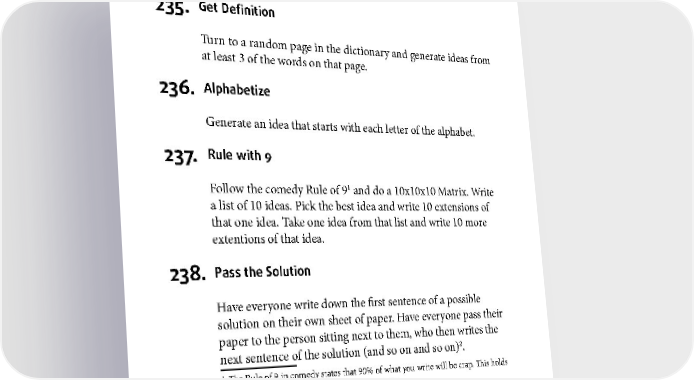 BRAINSTORMING 235. Get Definition Turn to a random page in the dictionary and generate ideas from at least 3 of the words on that page. 236. Alphabetize Generate an idea that starts with each letter of the alphabet. 237. Rule with 9 1 Follow the comedy Rule of 9 and do a 10x10x10 Matrix. Write a list of 10 ideas. Pick the best idea and write 10 extensions of that one idea. Take one idea from that list and write 10 more extentions of that idea. 238. Pass the Solution Have everyone write down the first sentence of a possible solution on their own sheet of paper. Have everyone pass their paper to the person sitting next to them, who then writes the next sentence of the solution (and so on and so on)2. 1 The Rule of 9 in comedy states that 90% of what you write will be crap. This holds true regardless of what level of comedy you are at. 2 Similar to the Telephone Pictionary game described in #111. 125