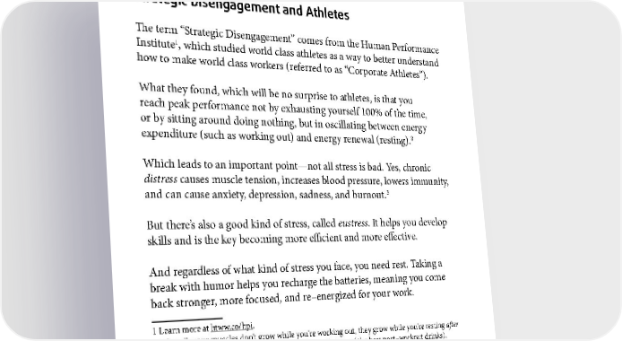 STRATEGIC DISENGAGEMENT Strategic Disengagement and Athletes The term “Strategic Disengagement” comes from the Human Performance 1 Institute , which studied world class athletes as a way to better understand how to make world class workers (referred to as “Corporate Athletes”). What they found, which will be no surprise to athletes, is that you reach peak performance not by exhausting yourself 100% of the time, or by sitting around doing nothing, but in oscillating between energy expenditure (such as working out) and energy renewal (resting).2 Which leads to an important point—not all stress is bad. Yes, chronic distress causes muscle tension, increases blood pressure, lowers immunity, 3 and can cause anxiety, depression, sadness, and burnout. But there’s also a good kind of stress, called eustress. It helps you develop skills and is the key becoming more efficient and more effective. And regardless of what kind of stress you face, you need rest. Taking a break with humor helps you recharge the batteries, meaning you come back stronger, more focused, and re–energized for your work. 1 Learn more at htww.co/hpi. 2 After all, your muscles don’t grow while you’re working out, they grow while you’re resting after you’ve worked out and are consuming chocolate milk (one of the best post–workout drinks). 3 See Stressed in America. 204
