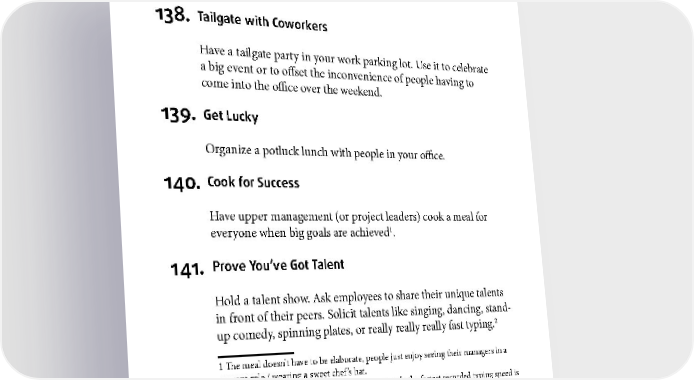 COMMUNITY BUILDING 138. Tailgate with Coworkers Have a tailgate party in your work parking lot. Use it to celebrate a big event or to offset the inconvenience of people having to come into the office over the weekend. 139. Get Lucky Organize a potluck lunch with people in your office. 140. Cook for Success Have upper management (or project leaders) cook a meal for 1 everyone when big goals are achieved . 141. Prove You’ve Got Talent Hold a talent show. Ask employees to share their unique talents in front of their peers. Solicit talents like singing, dancing, stand- 2 up comedy, spinning plates, or really really really fast typing. 1 The meal doesn’t have to be elaborate, people just enjoy seeing their managers in a servant role / wearing a sweet chef’s hat. 2 According to the Guinness Book of World Records, the fastest recorded typing speed is 212 wpm, held by Barbara Blackburn on a Dvorak keyboard. 81
