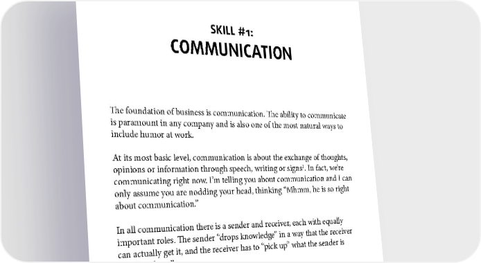 SKILL #1: COMMUNICATION The foundation of business is communication. The ability to communicate is paramount in any company and is also one of the most natural ways to include humor at work. At its most basic level, communication is about the exchange of thoughts, 1 opinions or information through speech, writing or signs . In fact, we’re communicating right now. I’m telling you about communication and I can only assume you are nodding your head, thinking “Mhmm, he is so right about communication.” In all communication there is a sender and receiver, each with equally important roles. The sender “drops knowledge” in a way that the receiver can actually get it, and the receiver has to “pick up” what the sender is “putting down”. 1 See Definition of Communication. 12