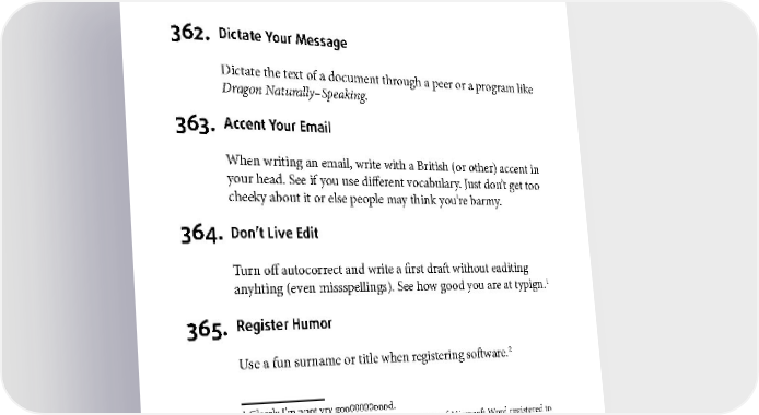 FUN FOR YOU 362. Dictate Your Message Dictate the text of a document through a peer or a program like Dragon Naturally–Speaking. 363. Accent Your Email When writing an email, write with a British (or other) accent in your head. See if you use different vocabulary. Just don’t get too cheeky about it or else people may think you’re barmy. 364. Don’t Live Edit Turn off autocorrect and write a first draft without eaditing 1 anyhting (even missspellings). See how good you are at typign. 365. Register Humor 2 Use a fun surname or title when registering software. 1 Claerly I’m nnot vry goo00000oood. 2 The first draft of this book was written in a copy of Microsoft Word registered to “Winnie the Drew.” 187