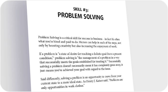 SKILL #3: PROBLEM SOLVING Problem Solving is a critical skill for success in business —in fact it’s often what you’re hired and paid to do. Humor can help in each of the steps , not only by boosting creativity but also increasing the enjoyment of work. If a problem is “a state of desire for reaching a definite goal from a present condition,”1 problem solving is “the management of a problem in a way 2 that successfully meets the goals established for treating it.” Successfully solving a problem doesn’t necessarily mean it has completely gone away, it just means you’ve achieved your goal with regard to the issue. Said differently, solving a problem is an opportunity to move from your current state to a more ideal state. As Henry J. Kaiser said, “Problems are only opportunities in work clothes.” 1 See Problem solving. 2 See Introduction to Problem Solving. 107