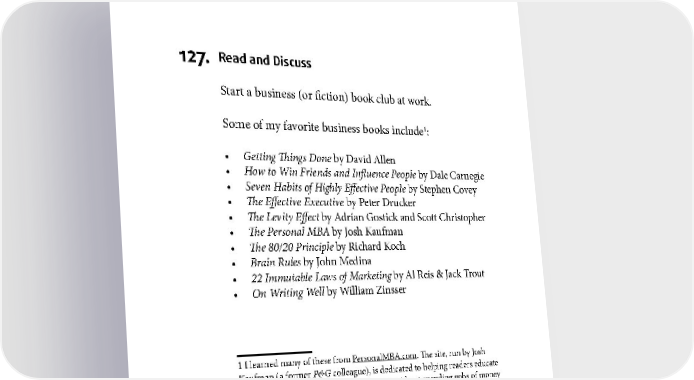NETWORKING 127. Read and Discuss Start a business (or fiction) book club at work. 1 Some of my favorite business books include : • Getting Things Done by David Allen • How to Win Friends and Influence People by Dale Carnegie • Seven Habits of Highly Effective People by Stephen Covey • The Effective Executive by Peter Drucker • The Levity Effect by Adrian Gostick and Scott Christopher • The Personal MBA by Josh Kaufman • The 80/20 Principle by Richard Koch • Brain Rules by John Medina • 22 Immutable Laws of Marketing by Al Reis & Jack Trout • On Writing Well by William Zinsser 1 I learned many of these from PersonalMBA.com. The site, run by Josh Kaufman (a former P&G colleague), is dedicated to helping readers educate themselves on advanced business concepts without spending gobs of money on an MBA. His book, The Personal MBA, is an international bestseller. 75