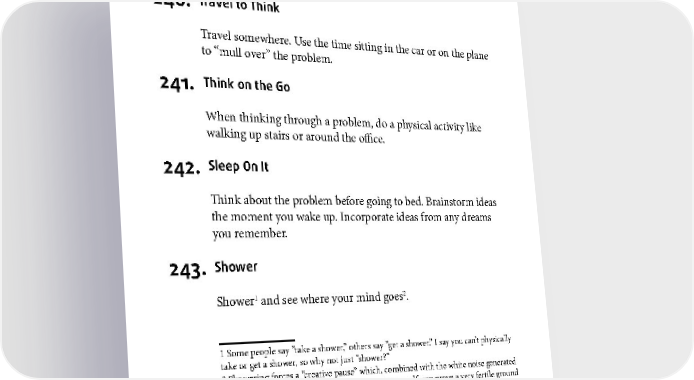 BRAINSTORMING 240. Travel to Think Travel somewhere. Use the time sitting in the car or on the plane to “mull over” the problem. 241. Think on the Go When thinking through a problem, do a physical activity like walking up stairs or around the office. 242. Sleep On It Think about the problem before going to bed. Brainstorm ideas the moment you wake up. Incorporate ideas from any dreams you remember. 243. Shower 1 2 Shower and see where your mind goes . 1 Some people say “take a shower,” others say “get a shower.” I say you can’t physically take or get a shower, so why not just “shower?” 2 Showering forces a “creative pause” which, combined with the white noise generated from the water and the distraction of cleaning yourself, can prove a very fertile ground for new ideas. See Creative pause. 127