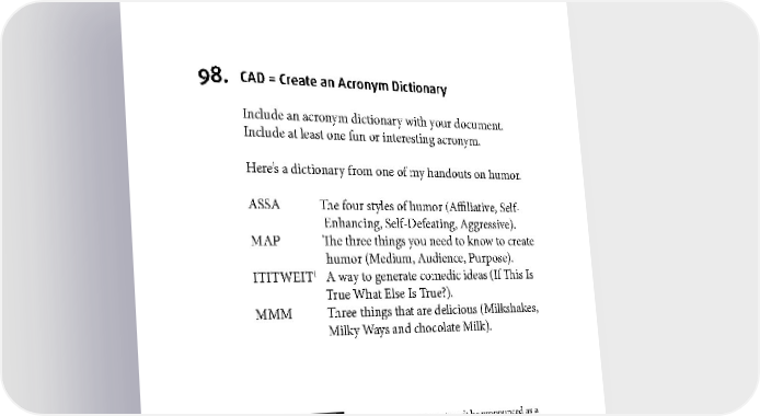 DOCUMENTS 98. CAD = Create an Acronym Dictionary Include an acronym dictionary with your document. Include at least one fun or interesting acronym. Here’s a dictionary from one of my handouts on humor. ASSA The four styles of humor (Affiliative, Self- Enhancing, Self-Defeating, Aggressive). MAP The three things you need to know to create humor (Medium, Audience, Purpose). 1 ITITWEIT A way to generate comedic ideas (If This Is True What Else Is True?). MMM Three things that are delicious (Milkshakes, Milky Ways and chocolate Milk). 1 Technically ITITWEIT is an initialism since it can’t be pronounced as a word. Or you could say it “eye tie tweet.” 57