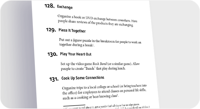NETWORKING 128. Exchange Organize a book or DVD exchange between coworkers. Have people share reviews of the products they are exchanging. 129. Piece It Together Put out a jigsaw puzzle in the breakroom for people to work on 1 together during a break . 130. Play Your Heart Out Set up the video game Rock Band (or a similar game). Allow people to create “Bands” that play during lunch. 131. Cook Up Some Connections Organize trips to a local college or school (or bring teachers into the office) for employees to attend classes on personal life skills, 2 such as a cooking or beer brewing class . 1 If you want to evil about it, get a puzzle that’s all sky or has no edge pieces. 2 Brewing beer probably isn’t a necessary personal life skill, but people tell me it’s fun. I personally like to “brew” my own chocolate milk flavors. Extra chocolate is the best. 76