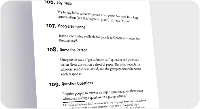 ICEBREAKERS 106. Say Hello Try to say hello to every person at an event. No need for a long conversation (but if it happens, great!). Just say, “Hello.” 107. Google Someone Have a computer available for people to Google each other (or themselves)1. 108. Guess the Person One person asks a “get to know you” question and everyone writes their answer on a sheet of paper. The asker collects the answers, reads them aloud, and the group guesses who wrote each response. 109. Question Questions Require people to answer a simple question about themselves 2 whenever asking a question in a group setting. 1 If you’re going to do this, I recommend letting the people know beforehand. Some people don’t like to be surprised when they’re going to be Googled all night. 2 “I’ll answer your question on the economy in just a second, but first, what’s your favorite number?” 65