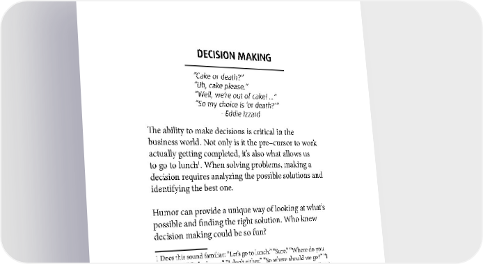DECISION MAKING “Cake or death?” ”Uh, cake please.” “Well, we’re out of cake! ...” “So my choice is ‘or death?’” - Eddie Izzard The ability to make decisions is critical in the business world. Not only is it the pre–cursor to work actually getting completed, it’s also what allows us 1 to go to lunch . When solving problems, making a decision requires analyzing the possible solutions and identifying the best one. Humor can provide a unique way of looking at what’s possible and finding the right solution. Who knew decision making could be so fun? 1 Does this sound familiar: “Let’s go to lunch.” “Sure.” “Where do you want to go?” “I don’t care.” “I don’t either.” “So where should we go?” “I don’t know.” SOMEONE JUST MAKE A DECISION (sorry for yelling). 128