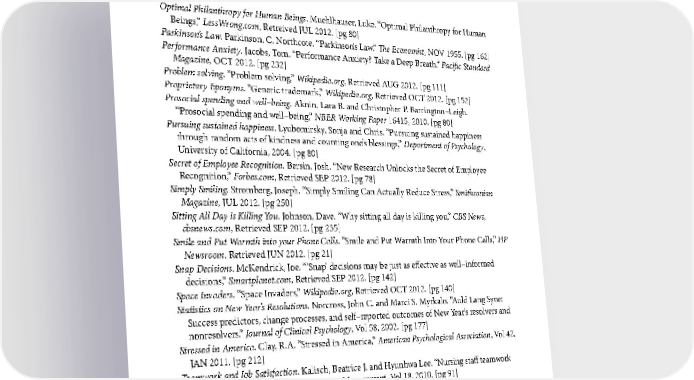 SOURCES Optimal Philanthropy for Human Beings. Muehlhauser, Luke. “Optimal Philanthropy for Human Beings,” LessWrong.com, Retreived JUL 2012. [pg 80] Parkinson’s Law. Parkinson, C. Northcote. “Parkinson’s Law,” The Economist, NOV 1955. [pg 162] Performance Anxiety. Jacobs, Tom. “Performance Anxiety? Take a Deep Breath.” Pacific Standard Magazine, OCT 2012. [pg 232] Problem solving. “Problem solving,” Wikipedia.org, Retrieved AUG 2012. [pg 111] Proprietary Eponyms. “Generic trademark,” Wikipedia.org, Retrieved OCT 2012. [pg 152] Prosocial spending and well–being. Aknin, Lara B. and Christopher P. Barrington–Leigh. “Prosocial spending and well–being,” NBER Working Paper 16415, 2010. [pg 80] Pursuing sustained happiness. Lyubomirsky, Sonja and Chris. “Pursuing sustained happiness through random acts of kindness and counting one’s blessings,” Department of Psychology, University of California, 2004. [pg 80] Secret of Employee Recognition. Bersin, Josh. “New Research Unlocks the Secret of Employee Recognition,” Forbes.com, Retrieved SEP 2012. [pg 78] Simply Smiling. Stromberg, Joseph. “Simply Smiling Can Actually Reduce Stress,” Smithsonian Magazine, JUL 2012. [pg 250] Sitting All Day is Killing You. Johnson, Dave. “Why sitting all day is killing you,” CBS News, cbsnews.com, Retrieved SEP 2012. [pg 235] Smile and Put Warmth into your Phone Calls. “Smile and Put Warmth Into Your Phone Calls,” HP Newsroom, Retrieved JUN 2012. [pg 21] Snap Decisions. McKendrick, Joe. “’Snap’ decisions may be just as effective as well–informed decisions,” Smartplanet.com, Retrieved SEP 2012. [pg 142] Space Invaders. “Space Invaders,” Wikipedia.org, Retrieved OCT 2012. [pg 140] Statistics on New Year’s Resolutions. Norcross, John C. and Marci S. Myrkalo. “Auld Lang Syne: Success predictors, change processes, and self–reported outcomes of New Year’s resolvers and nonresolvers.” Journal of Clinical Psychology, Vol 58, 2002. [pg 177] Stressed in America. Clay, R.A. “Stressed in America,” American Psychological Association, Vol 42, JAN 2011. [pg 212] Teamwork and Job Satisfaction. Kalisch, Beatrice J. and Hyunhwa Lee. “Nursing staff teamwork and job satisfaction,” Journal of Nursing Management, Vol 18, 2010. [pg 91] 260