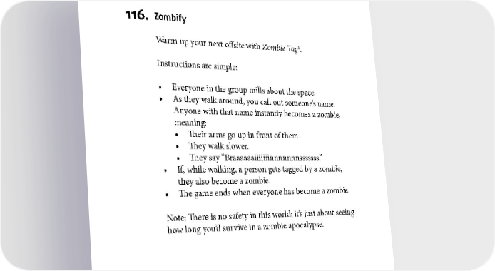 ICEBREAKERS 116. Zombify Warm up your next offsite with Zombie Tag1. Instructions are simple: • Everyone in the group mills about the space. • As they walk around, you call out someone’s name. Anyone with that name instantly becomes a zombie, meaning: • Their arms go up in front of them. • They walk slower. • They say “Braaaaaaiiiiiiinnnnnnnsssssss.” • If, while walking, a person gets tagged by a zombie, they also become a zombie. • The game ends when everyone has become a zombie. Note: There is no safety in this world; it’s just about seeing how long you’d survive in a zombie apocalypse. 1 To see video of this in action, visit htww.co/zombietag. 69