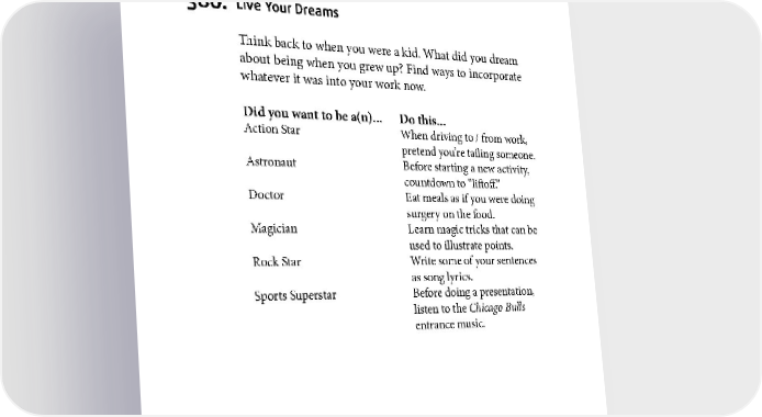 FUN FOR YOU 380. Live Your Dreams Think back to when you were a kid. What did you dream about being when you grew up? Find ways to incorporate whatever it was into your work now. Did you want to be a(n)... Do this... Action Star When driving to / from work, pretend you’re tailing someone. Astronaut Before starting a new activity, countdown to “liftoff.” Doctor Eat meals as if you were doing surgery on the food. Magician Learn magic tricks that can be used to illustrate points. Rock Star Write some of your sentences as song lyrics. Sports Superstar Before doing a presentation, listen to the Chicago Bulls entrance music. 193
