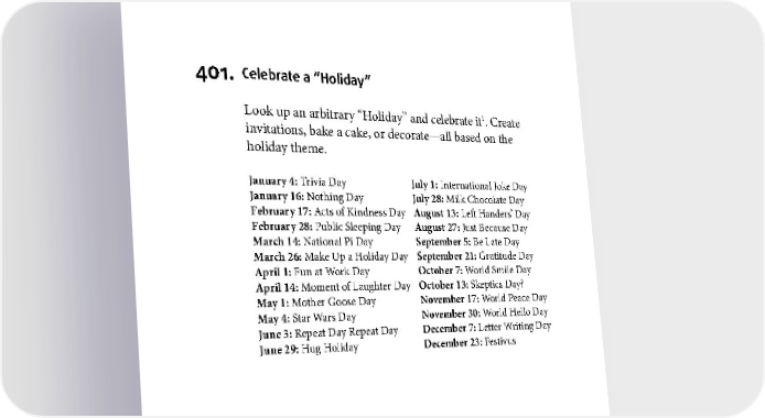 ENERGIZER 401. Celebrate a “Holiday” 1 Look up an arbitrary “Holiday” and celebrate it . Create invitations, bake a cake, or decorate—all based on the holiday theme. January 4: Trivia Day July 1: International Joke Day January 16: Nothing Day July 28: Milk Chocolate Day February 17: Acts of Kindness Day August 13: Left Handers’ Day February 28: Public Sleeping Day August 27: Just Because Day March 14: National Pi Day September 5: Be Late Day March 26: Make Up a Holiday Day September 21: Gratitude Day April 1: Fun at Work Day October 7: World Smile Day April 14: Moment of Laughter Day October 13: Skeptics Day? May 1: Mother Goose Day November 17: World Peace Day May 4: Star Wars Day November 30: World Hello Day June 3: Repeat Day Repeat Day December 7: Letter Writing Day June 29: Hug Holiday December 23: Festivus 1 Find more holidays at htww.co/holidays. 207