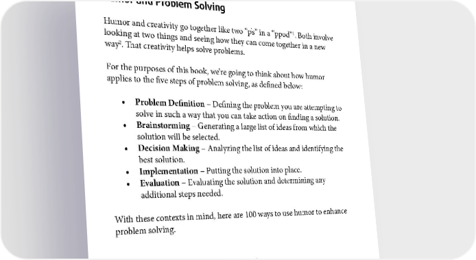 PROBLEM SOLVING Humor and Problem Solving Humor and creativity go together like two “p’s” in a “ppod”1. Both involve looking at two things and seeing how they can come together in a new 2 way . That creativity helps solve problems. For the purposes of this book, we’re going to think about how humor applies to the five steps of problem solving, as defined below: • Problem Definition – Defining the problem you are attempting to solve in such a way that you can take action on finding a solution. • Brainstorming – Generating a large list of ideas from which the solution will be selected. • Decision Making – Analyzing the list of ideas and identifying the best solution. • Implementation – Putting the solution into place. • Evaluation – Evaluating the solution and determining any additional steps needed. With these contexts in mind, here are 100 ways to use humor to enhance problem solving. 1 I’ve never understand that expression. What’s a ppod? 2 See Laughing All the Way to the Bank. 109