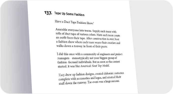 COMMUNITY BUILDING 137. Tape Up Some Fashion 1 Have a Duct Tape Fashion Show. Assemble everyone into teams. Supply each team with rolls of duct tape of various colors. Have each team create an outfit from their tape. After construction is over, host a fashion show where each team wears their creation and walks down a runway in front of their peers. I did this once with a community of engineers and project managers—stereotypically not your biggest group of fashion–focused individuals. But as soon as the contest started, it was like America’s Next Top Model. They drew up fashion designs, created elaborate costumes complete with accessories and logos, and strutted their stuff down the runway. The event was a huge success. 1 For pictures of incredible costumes made of duct tape, see htww.co/duct. 80