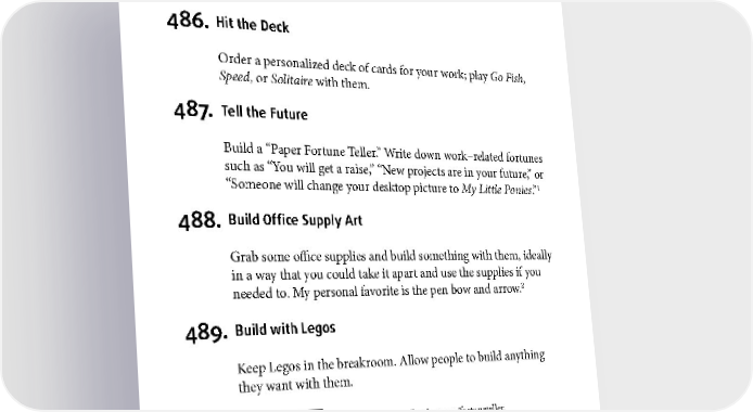 PLAY 486. Hit the Deck Order a personalized deck of cards for your work; play Go Fish, Speed, or Solitaire with them. 487. Tell the Future Build a “Paper Fortune Teller.” Write down work–related fortunes such as “You will get a raise,” “New projects are in your future,” or “Someone will change your desktop picture to My Little Ponies.”1 488. Build Office Supply Art Grab some office supplies and build something with them, ideally in a way that you could take it apart and use the supplies if you 2 needed to. My personal favorite is the pen bow and arrow. 489. Build with Legos Keep Legos in the breakroom. Allow people to build anything they want with them. 1 To learn how to build a Paper Fortune Teller: htww.co/fortuneteller. 2 For inspiration, check out htww.co/officesupplyart. 245
