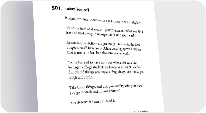 THE FINAL WAY 501. Humor Yourself 1 Brainstorm your own way to use humor in the workplace. It’s not as hard as it seems—just think about what you find fun and find a way to incorporate it into your work. Assuming you follow the general guidelines in the first chapter, you’ll have no problem coming up with humor that is not only fun, but also effective at work. You’ve learned to have fun your whole life: as a kid, teenager, college student, and even as an adult. You’ve discovered things you enjoy doing, things that make you laugh and smile. Take those things, and that personality, with you when you go to work and humor yourself. You deserve it / want it/ need it. 1 Got a great idea you want to share? Submit it at htww.co/submit so others can learn about your humor genius! 252