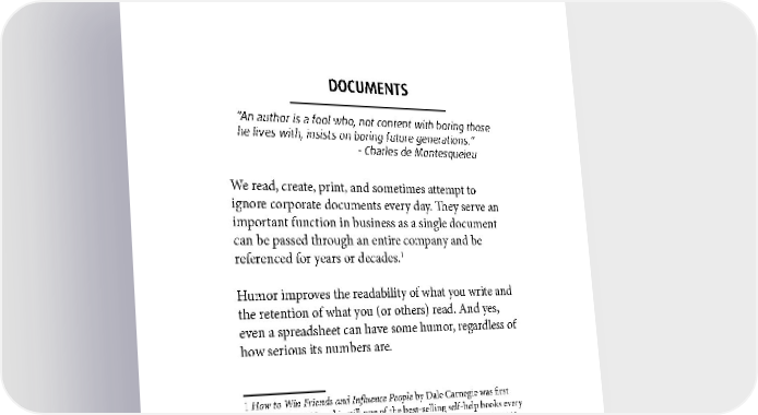 DOCUMENTS “An author is a fool who, not content with boring those he lives with, insists on boring future generations.” - Charles de Montesqueieu We read, create, print, and sometimes attempt to ignore corporate documents every day. They serve an important function in business as a single document can be passed through an entire company and be 1 referenced for years or decades. Humor improves the readability of what you write and the retention of what you (or others) read. And yes, even a spreadsheet can have some humor, regardless of how serious its numbers are. 1 How to Win Friends and Influence People by Dale Carnegie was first published in 1936 and is still one of the best-selling self-help books every year. It was ranked #5 on Business Pundits’ 50 Best Business Books 2012. 49
