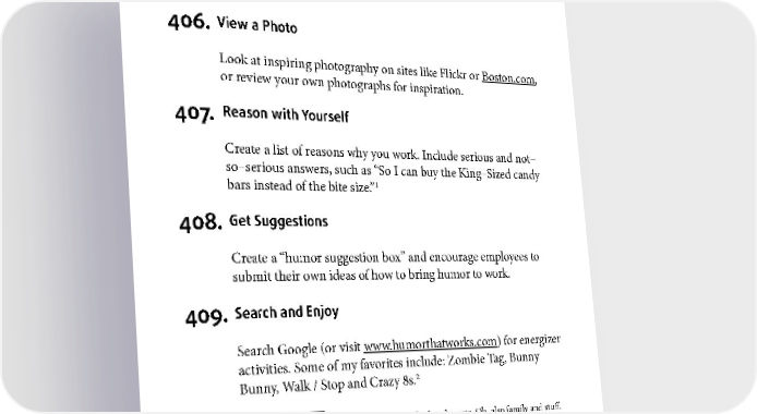 ENERGIZER 406. View a Photo Look at inspiring photography on sites like Flickr or Boston.com, or review your own photographs for inspiration. 407. Reason with Yourself Create a list of reasons why you work. Include serious and not– so–serious answers, such as “So I can buy the King–Sized candy 1 bars instead of the bite size.” 408. Get Suggestions Create a “humor suggestion box” and encourage employees to submit their own ideas of how to bring humor to work. 409. Search and Enjoy Search Google (or visit www.humorthatworks.com) for energizer activities. Some of my favorites include: Zombie Tag, Bunny 2 Bunny, Walk / Stop and Crazy 8s. 1 This is a large part of why I work. That and other desserts. Oh, also family and stuff. 2 For an explanation of these energizers, visit htww.co/energizers. 209