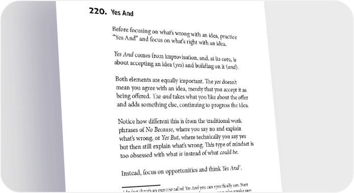 BRAINSTORMING 220. Yes And Before focusing on what’s wrong with an idea, practice “Yes And” and focus on what’s right with an idea. Yes And comes from improvisation, and, at its core, is about accepting an idea (yes) and building on it (and). Both elements are equally important. The yes doesn’t mean you agree with an idea, merely that you accept it as being offered. The and takes what you like about the offer and adds something else, continuing to progress the idea. Notice how different this is from the traditional work phrases of No Because, where you say no and explain what’s wrong, or Yes But, where technically you say yes but then still explain what’s wrong. This type of mindset is too obsessed with what is instead of what could be. 1 Instead, focus on opportunities and think Yes And . 1 In fact there’s an exercise called Yes And you can specifically use. Start brainstorming out loud. After each idea, the next person who speaks says “Yes, and...” then adds something to the idea. 119