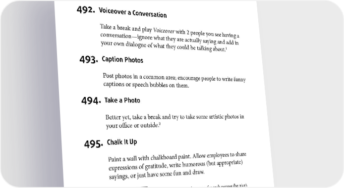 PLAY 492. Voiceover a Conversation Take a break and play Voiceover with 2 people you see having a conversation—ignore what they are actually saying and add in 1 your own dialogue of what they could be talking about. 493. Caption Photos Post photos in a common area; encourage people to write funny captions or speech bubbles on them. 494. Take a Photo Better yet, take a break and try to take some artistic photos in your office or outside.2 495. Chalk It Up Paint a wall with chalkboard paint. Allow employees to share expressions of gratitude, write humorous (but appropriate) sayings, or just have some fun and draw. 1 For added fun, do this with a peer. Create characters for each person (be nice). 2 You can also offer to take “headshots” for your coworkers (think Glamour Shots). 248
