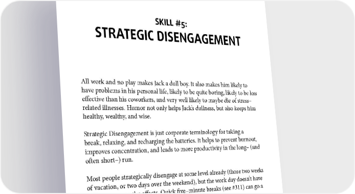 SKILL #5: STRATEGIC DISENGAGEMENT All work and no play makes Jack a dull boy. It also makes him likely to have problems in his personal life, likely to be quite boring, likely to be less effective than his coworkers, and very well likely to maybe die of stress– related illnesses. Humor not only helps Jack’s dullness, but also keeps him healthy, wealthy, and wise. Strategic Disengagement is just corporate terminology for taking a break, relaxing, and recharging the batteries. It helps to prevent burnout, improves concentration, and leads to more productivity in the long– (and often short–) run. Most people strategically disengage at some level already (those two weeks of vacation, or two days over the weekend), but the work day doesn’t have to be over to see the effects. Quick five–minute breaks (see #311) can go a long way in improving your effectiveness all day long. 203