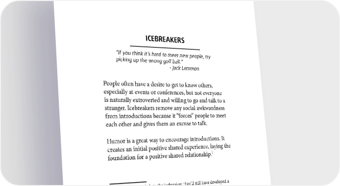 ICEBREAKERS “If you think it’s hard to meet new people, try picking up the wrong golf ball.” - Jack Lemmon People often have a desire to get to know others, especially at events or conferences, but not everyone is naturally extroverted and willing to go and talk to a stranger. Icebreakers remove any social awkwardness from introductions because it “forces” people to meet each other and gives them an excuse to talk. Humor is a great way to encourage introductions. It creates an initial positive shared experience, laying the 1 foundation for a positive shared relationship. 1 And even if people hate the icebreaker, they’ll still have developed a relationship... it’s virtually fail-proof. 62