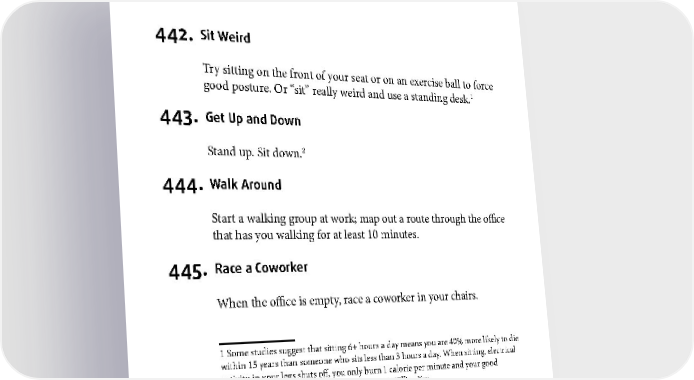 PHYSICAL ACTIVITY 442. Sit Weird Try sitting on the front of your seat or on an exercise ball to force 1 good posture. Or “sit” really weird and use a standing desk. 443. Get Up and Down Stand up. Sit down.2 444. Walk Around Start a walking group at work; map out a route through the office that has you walking for at least 10 minutes. 445. Race a Coworker When the office is empty, race a coworker in your chairs. 1 Some studies suggest that sitting 6+ hours a day means you are 40% more likely to die within 15 years than someone who sits less than 3 hours a day. When sitting, electrical activity in your legs shuts off, you only burn 1 calorie per minute and your good cholesterol drops by 20%. See Sitting All Day is Killing You. 2 Congratulations, you’ve just burned 2 calories and increased your heart rate! 226