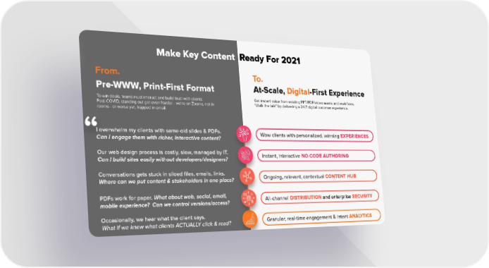 Make Key Content Ready For 2021 SUMMARYEXPERIENCEDISTRIBUTIONANALYTICS From. To. At-Scale, Digital-First Experience Pre-WWW, Print-First Format To win deals, teams must interact and build trust with clients. Get instant value from existing PPT/PDF/video assets and workflows. Post-COVID, standing out got even harder - we’re on Zooms, not in “Walk the talk” by delivering a 24/7 digital customer experience. rooms - or worse yet, trapped in email. I overwhelm my clients with same-old slides & PDFs. Wow clients with personalized, winning EXPERIENCES Can I engage them with richer, interactive content? Lack of client engagement Our web design process is costly, slow, managed by IT. Instant, interactive NO-CODE AUTHORING Can I build sites easily without developers/designers? Suboptimal distribution Conversations gets stuck in siloed files, emails, links. Ongoing, relevant, contextual CONTENT HUB No feedback or MI Where can we put content & stakeholders in one place? PDFs work for paper. What about web, social, email, All-channel DISTRIBUTION and enterprise SECURITY mobile experience? Can we control versions/access? Occasionally, we hear what the client says. Granular, real-time engagement & intent ANALYTICS What if we knew what clients ACTUALLY click & read? Summary Experience Distribution Analytics