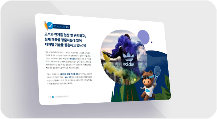 고객과�관계를�형성�및�관리하고, 실제�매출을�창출하는데�있어 디지털�기술을�활용하고�있는가? 우리 기업이 디지털 퍼스트 기업인지 체크하려면 디지털로 고객과의 관계를 형성하고 있는지, 아울러 디지털에서 얼마나 많은 수익을 얻고 있는지 체크해봐야 한다. 예를 들어 아디다스는 팬데믹으로 큰 위기를 맞았다. 팬데믹 이후 실내에서 생활하는 시간이 많아지면서 스포츠용품 판매가 줄어드는 것을 막기는 힘들었다. 세계 �,���개의 아디다스 매장 방문객은 급감했으며, 일부 매장은 폐쇄되기도 했다. 그러나 아디다스는 디지털을 통해 위기를 극복해가고 있다. ����년 아디다스의 온라인 판매는 ��% 성장했다. 이제 아디다스 매출의 ��% 이상이 디지털에서 나오고 있다. 아디다스는 ����년까지 디지털 매출을 두 배 끌어 올리겠다는 계획을 발표했다. 7 �가지 체크리스트로 돌아가기