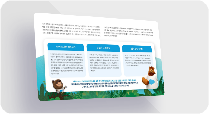 특히 디지털 트랜스포메이션이라는 목표에 달성하기 위해서는 각 산업마다 주어지는 과제가 있다. 소매업 등 어느 산업에 종사하고 있든 관계없이 각자 환경에 맞는 디지털 트랜스포메이션을 이뤄야 한다. 예를 들어 식료품점이라면 수천, 수만 개의 SKU를 관리하고, 픽&팩 해야 한다. 금융기관이라면 이를 위해 세일즈포스는 ʻ산업별 디지털 ���’을 제공한다. 세일즈포스가 수많은 고객의 성공사례를 온라인에서 대출을 진행하면서도 규제를 지킬 수 있어야 하다. 정부기관이나 지방자치단체라면 분석해 만든 레퍼런스로, 산업별 애플리케이션, 툴킷, 안내서를 제공한다. 그렇다면 디지털 퍼스트를 코로나�� 정보를 시민들에게 빠르게 공유할 수 있는 환경을 구축해야 한다. 은행, 보험, 제조, 통신, 위해 무엇부터 해야할까? 데이터 기반 비즈니스 연결된 고객경험 일하는 방식 혁신 우선 고객이 누구인지, 어떻게 상호작용하는지 등 고객을 ���도 고객은 웹사이트, 모바일 앱, 이메일, 전화, 챗봇, 소셜미디어 등 ����년 기준 ��개국의 글로벌 마케팅 리더 중 ��%만이 관점에서 파악해기 위해서는 CDP(고객 데이터 플랫폼)를 이용 다양한 채널로 우리 기업에 다가온다. 고객의 디지털 여정을 직원들이 사무실 근무로 복귀할 것이라고 답하였고, ��%는 하는 것이 효율적이다. CDP는 다양한 채널의 고객 개개인의 담당하는 시스템과 부서가 사일로(silo)화 되어 있으면 다양한 회사가 원격 업무 방식을 채택하였다고 답했다. 부서간 단절은 데이터를 수집·통합·분석해 개인화 마케팅을 지원하는 플랫폼이다. 채널로 접근하는 고객에게 일관된 고객경험을 제공할 수 없다. 고객경험의 단절을 야기하기 때문에 조직 내의 긴밀한 협업과 세계적으로 우수한 성과를 내고 있는 마케팅 리더의 ��%는 업종에 관계없이 e커머스 영역을 확충하고, 모바일 친화적인지 정보공유는 매우 중요한 요소다. CDP를 사용하고 있는 것으로 전해졌다. 데이터를 통해 노력한 체크해야 한다. 또 AI 등의 기술을 활용해 고객 경험을 최적화 성과와 현황을 더 세밀하고 정확하게 측정하고, 최적화한 미래를 해야 한다. 설계해야 한다. 세일즈포스 ʻ디지털 ���’은 차세대 통합 고객경험을 제공하고 비즈니스 성장을 가속할 수 있도록 돕는다. 여러 채널에서 연결되고 개인화된 고객경험을 제공하기 위해서는 모든 디지털 고객접점에 걸쳐 고객에 대해 이해하고, 그들에게 고도화된 가치를 제공하기 위한 ���도 뷰를 확보가 필수적일 것이다.