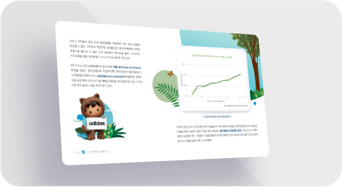 그러나 아마존과 같은 외부 플랫폼에만 의존하면 이와 같은 목표를 달성할 수 없다. 고객과의 직접적인 관계를 맺지 못하기 때문에 고객의 로열티를 끌어낼 수 없다. 외부 채널에서 판매량을 늘리기 위해서는 가격경쟁을 벌일 수밖에 없고, 이는 수익성 약화로 이어진다. 아디다스는 이런 문제에 빠지지 않기 위해 ʻ게임 소유(Own the Game)’ 전략을 세웠다. 온라인에서도 직접적으로 고객의 데이터를 확보하고, 고객경험을 관리해 나가는 D2C(Direct to Customer) 방식을 택한 것이다. 이를 통해 향후 �년간 디지털 멤버십 회원을 �억����만 명 이상, �억 명 내외까지 늘리는 것을 목표로 하고 있다. 디지털 전환과 매출의 상관관계 (출처: 발루아) 미국의 생산성 조사 전문업체인 발루아(Valoir)가 세계 ����개 업체를 조사해 발표한 보고서 따르면, 디지털 전환에 성공한 기업은 그렇지 못한 기업보다 �배 빠르게 성장하고 있다. 이 보고서는 “이익과 성장의 상위권에 있는 기업들은 기술을 활용해 이전에 운영했던 것과 확연히 다른 비용구조의 새로운 비즈니스 모델을 내놓고 있다”고 분석했다. 8 �가지 체크리스트로 돌아가기