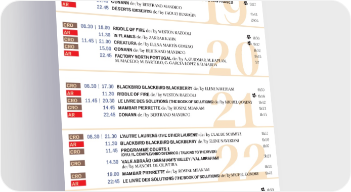 THÉÂTRE CROISETTE / JW MARRIOT OLY AR ESPACE MIRAMAR 16 CRO 08.30 LE PROCÈS GOLDMAN (THE GOLDMAN CASE) de / by CÉDRIC KAHN 1h56 CRO 12.30 FACTORY NORTH PORTUGAL de / by A. GUIOMAR, M. KAPLAN, 53’ M. MACEDO, M. BÁRTOLO, G. GARCÍA LÓPEZ D. HAIHA CRO 15.00 CARROSSE D’OR : DEN MUSO (LA JEUNE FILLE) de / by OULEMANE CIÉ 1h CRO 16.30 CARROSSE D’OR : CONVERSATION ENTRE SOULEYMANE CISSÉ ET DES CINÉASTES CRO 19.30 OUVERTURE / OPENING LE PROCÈS GOLDMAN (THE GOLDMAN CASE) de / by CÉDRIC KAHN 1h56 17 CRO 08.30 | 17.30 DÉSERTS (DESERTS) de / by AOUZI BENAÏDI h€‚ CRO 12.00 | 20.45 THE SWEET EAST de / by EAN PRICE ƒILLIAM 1h‚‚ CRO 15.00 UN PRINCE (A PRINCE) de / by PIERRE CRETON 1h 18 CRO 08.30 | 16.30 IN FLAMES de / by ZARRAR KAHN 1h3„ CRO 11.15 UN PRINCE (A PRINCE) de / by PIERRE CRETON 1h AR 11.30 THE SWEET EAST de / by EAN PRICE ƒILLIAM 1h‚‚ CRO 13.45 | 19.15 THE FEELING THAT THE TIME FOR DOING SOMETHING HAS PASSED 1h„ de / by OANNA ARNOƒ CRO 21.45 CONANN de / by BERTRAND MANDICO 1h‚5 AR 22.45 DÉSERTS (DESERTS) de / by AOUZI BENAÏDI h€‚ 19 CRO 08.30 | 18.00 RIDDLE OF FIRE de / by ƒETON RAZOOLI 1h56 AR 11.30 IN FLAMES de / by ZARRAR KAHN 1h3„ CRO 11.45 | 21.00 CREATURA de / by ELENA MARTÍN GIMENO 1h5 CRO 15.00 CONANN de / by BERTRAND MANDICO 1h‚5 AR 22.45 FACTORY NORTH PORTUGAL de / by A. GUIOMAR, M. KAPLAN, 53’ M. MACEDO, M. BÁRTOLO, G. GARCÍA LÓPEZ D. HAIHA 20 CRO 08.30 | 17.30 LACIRD LACIRD LACERRY de / by ELENE NA…ERIANI 1h5€ AR 11.30 RIDDLE OF FIRE de / by ƒETON RAZOOLI 1h56 CRO 11.45 | 20.30 LE LIVRE DES SOLUTIONS (THE OO OF SOLUTIONS) de / by MICHEL GONDR 1h‚ CRO 14.45 MAMAR PIERRETTE de / by ROINE MBAKAM 1h33 AR 22.45 CONANN de / by BERTRAND MANDICO 1h‚5 21 CRO 08.30 | 21.30 L’AUTRE LAURENS (THE OTHER LAURENS) de / by CLAUDE CHMITZ 1h5„ AR 11.30 LACIRD LACIRD LACERRY de / by ELENE NA…ERIANI 1h5€ CRO 11.45 PROGRAMME COURTS 1h€„ (OYU / IL COMPLEANNO DI ENRICO / TALING TO THE RIVER) CRO 14.30 VALE ARAÃO (ARAHAM’S VALLEY / VAL ARAHAM) 3h3 de / by MANOEL DE OLI…EIRA CRO 19.00 MAMAR PIERRETTE de / by ROINE MBAKAM 1h33 AR 22:45 LE LIVRE DES SOLUTIONS (THE OO OF SOLUTIONS) de / by MICHEL GONDR 1h‚ 22 CRO 08.30 | 15.00 LAH (GRACE / LA GRÂCE) de / by ILA PO…OLOTK 1h5† AR 11.30 L’AUTRE LAURENS (THE OTHER LAURENS) de / by CLAUDE CHMITZ 1h5„ CRO 11.45 | 18.00 LÉGUA de / by ILIPA REI OÃO MILLER GUERRA 1h5† CRO 21.00 IAO AI CHUAN (A SONG SUNG LUE) de / by ZIHAN GENG 1h3 AR 22.45 THE FEELING THAT THE TIME FOR DOING SOMETHING HAS PASSED 1h„ de / by OANNA ARNOƒ 23 CRO 08.30 IAO AI CHUAN (A SONG SUNG LUE) de / by ZIHAN GENG 1h3 CRO 11.15 PROGRAMME COURTS (J’AI VU LE VISAGE DU DIALE / 1h3 MARGARETHE € / THE RED SEA MAES ME WANNA CRY / MAST-DEL) AR 11.30 LAH (GRACE / LA GRÂCE) de / by ILA PO…OLOTK 1h5† CRO 14.15 PROGRAMME COURTS ƒ (THE HOUSE IS ON FIRE„ 1h5 MIGHT AS WELL GET WARM / LEMON TREE / DANS LA TÊTE UN ORAGE) CRO 16.45 ÊN TRONG VỎ ÉN VÀNG (INSIDE THE YELLOW COCOON SHELL) 3h€ de / by THIEN AN PHAM CRO 20.45 AGRA de / by KANU BEHL h1 AR 22.45 LÉGUA de / by ILIPA REI OÃO MILLER GUERRA 1h5† 24 CRO 08.30 AGRA de / by KANU BEHL h1 CRO 12.00 ÊN TRONG VỎ ÉN VÀNG (INSIDE THE YELLOW COCOON SHELL) 3h€ de / by THIEN AN PHAM O LY 12.00 IAO AI CHUAN (A SONG SUNG LUE) de / by ZIHAN GENG 1h3 CRO 16.15 RENDE-VOUS AVEC / WITH ‡UENTIN TARANTINO FILM SURPRISE ˆ CONVERSATION AVEC/WITH ‡UENTIN TARANTINO CRO 20.30 CLÔTURE / CLOSING WOO-RI-UI-HA-RU (IN OUR DAY) de / by HONG ANGOO 1h‚ O LY 21.00 CREATURA de / by ELENA MARTÍN GIMENO 1h5 25 CRO 08.30 LE PROCÈS GOLDMAN (THE GOLDMAN CASE) de / by CÉDRIC KAHN 1h56 CRO 11.30 WOO-RI-UI-HA-RU (IN OUR DAY) de / by HONG ANGOO 1h‚ O LY 12.00 AGRA de / by KANU BEHL h1 CRO 14.15 LE LIVRE DES SOLUTIONS (THE OO OF SOLUTIONS) de / by MICHEL GONDR 1h‚ CRO 17.00 RIDDLE OF FIRE de / by ƒETON RAZOOLI 1h56 CRO 20.00 DÉSERTS (DESERTS) de / by AOUZI BENAÏDI h€‚ O LY 21.00 WOO-RI-UI-HA-RU (IN OUR DAY) de / by HONG ANGOO 1h‚ 26 CRO THÉÂTRE CROISETTE / JW MARRIOTT BILLET UNIQUEMENT / ONLY DE SALLE DEUSSY AV SALLE AGNÈS VARDA BGE BILLET BGE BILLET U SALLE UÑUEL A SALLE AIN BGE BILLET BGE BILLET