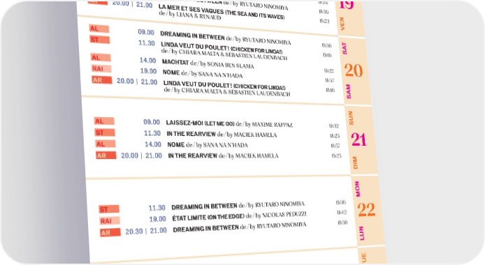 ESPACE MIRAMAR OLY AR ST AL RAI TUE 16 MAR WED AR 20.30 | 21.00 LAISSEZ-MOI (LET ME GO) de / by MAXIME RAPPAZ 1h32 17 MER AL 09.00 IN THE REARVIEW de / by MACIEK HAMELA 1h25 THU ST 11.30 ÉTAT LIMITE (ON THE EDGE) de / by NICOLAS PEDUZZI 1h42 AL 14.00 LIND A VEUT DU POULET ! (CHICKEN FOR LINDA!) 1h16 18 de / by CHIARA MALTA & SÉBASTIEN LAUDENBACH RAI 16.30 MACHTAT de / by SONIA BEN SLAMA 1h22 AR 20.30 | 21.00 ÉTAT LIMITE (ON THE EDGE) de / by NICOLAS PEDUZZI 1h42 JEU AL 09.00 NOME de / by SANA NA N’HADA 1h57 FRI ST 11.30 LA MER ET SES VAGUES (THE SEA AND ITS WAVES) 1h23 de / by LIANA & RENAUD AL 14.00 CAITI BLUES de / by USTINE HARBONNIER 1h24 19 RAI 19.00 DREAMING IN BETWEEN de / by RUTARO NINOMIA 1h36 AR 20.00 | 21.00 LA MER ET SES VAGUES (THE SEA AND ITS WAVES) 1h23 de / by LIANA & RENAUD VEN AL 09.00 DREAMING IN BETWEEN de / by RUTARO NINOMIA 1h36 T ST 11.30 LIND A VEUT DU POULET ! (CHICKEN FOR LINDA!) 1h16 SA de / by CHIARA MALTA & SÉBASTIEN LAUDENBACH AL 14.00 MACHTAT de / by SONIA BEN SLAMA 1h22 20 RAI 19.00 NOME de / by SANA NA N’HADA 1h57 AR 20.00 | 21.00 LIND A VEUT DU POULET ! (CHICKEN FOR LINDA!) 1h16 M de / by CHIARA MALTA & SÉBASTIEN LAUDENBACH SA UN AL 09.00 LAISSEZ-MOI (LET ME GO) de / by MAXIME RAPPAZ 1h32 S ST 11.30 IN THE REARVIEW de / by MACIEK HAMELA 1h25 21 AL 14.00 NOME de / by SANA NA N’HADA 1h57 AR 20.00 | 21.00 IN THE REARVIEW de / by MACIEK HAMELA 1h25 DIM MON ST 11.30 DREAMING IN BETWEEN de / by RUTARO NINOMIA 1h36 RAI 19.00 ÉTAT LIMITE (ON THE EDGE) de / by NICOLAS PEDUZZI 1h42 22 AR 20.30 | 21.00 DREAMING IN BETWEEN de / by RUTARO NINOMIA 1h36 UN L TUE ST 11.30 CAITI BLUES de / by USTINE HARBONNIER 1h24 23 AR 20.00 | 21.00 CAITI BLUES de / by USTINE HARBONNIER 1h24 MAR AL 09.00 ÉTAT LIMITE (ON THE EDGE) de / by NICOLAS PEDUZZI 1h42 WED ST 11.30 MACHTAT de / by SONIA BEN SLAMA 1h22 AL 14.00 LA MER ET SES VAGUES (THE SEA AND ITS WAVES) 1h23 de / by LIANA & RENAUD 24 RAI 19.00 LIND A VEUT DU POULET ! (CHICKEN FOR LINDA!) 1h16 de / by CHIARA MALTA & SÉBASTIEN LAUDENBACH AR 20.00 MACHTAT de / by SONIA BEN SLAMA 1h22 MER THU ST 11.30 NOME de / by SANA NA N’HADA 1h57 25 O LY 20.00 NOME de / by SANA NA N’HADA 1h57 JEU FRI ST 11.30 LAISSEZ-MOI (LET ME GO) de / by MAXIME RAPPAZ 1h32 26 RAI 19.00 IN THE REARVIEW de / by MACIEK HAMELA 1h25 VEN O LY OLYMPIA T BILLET UNIQUEMENT / ONLY AL ALEANDRE III SA AR LES ARCADES BILLET UNIQUEMENT / ONLY BILLET UNIQUEMENT / ONLY RAI LE RAIMU 27 ST STUDIO BILLET UNIQUEMENT / ONLY BILLET UNIQUEMENT / ONLY M SA