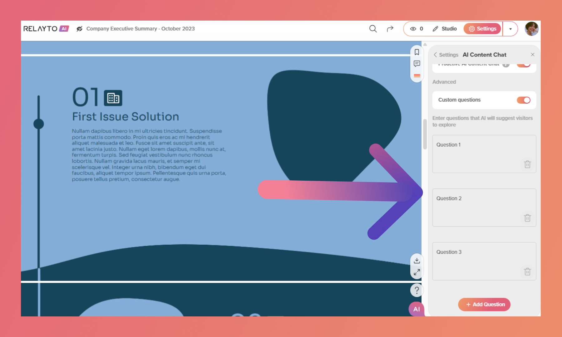 Now you can add your own suggested questions! Look for the + Add Question button to include as many as you need. Try it out and customize the experience to fit your goals.