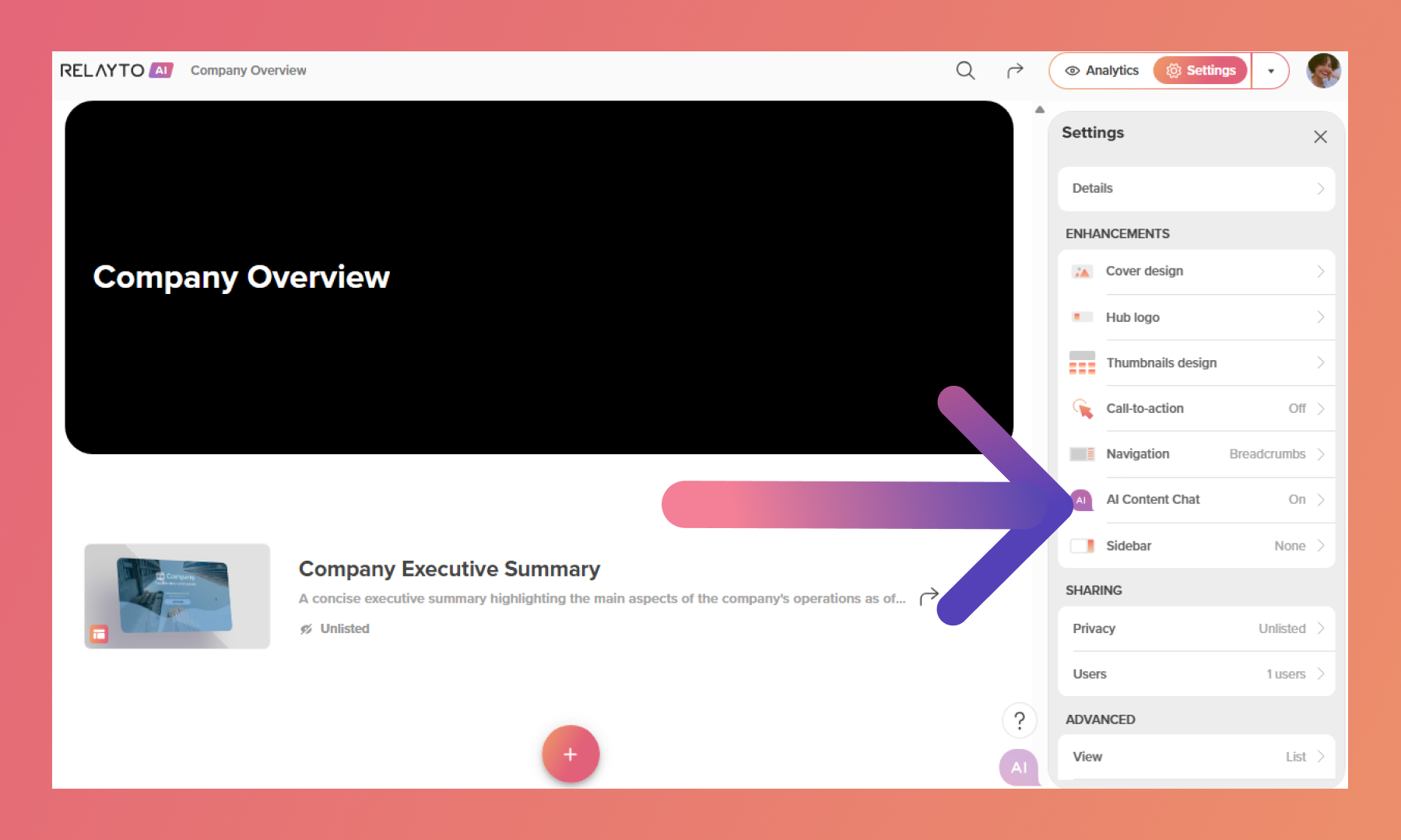 Open the AI Content Chat settings. The steps above are for either content or hubs to get there.