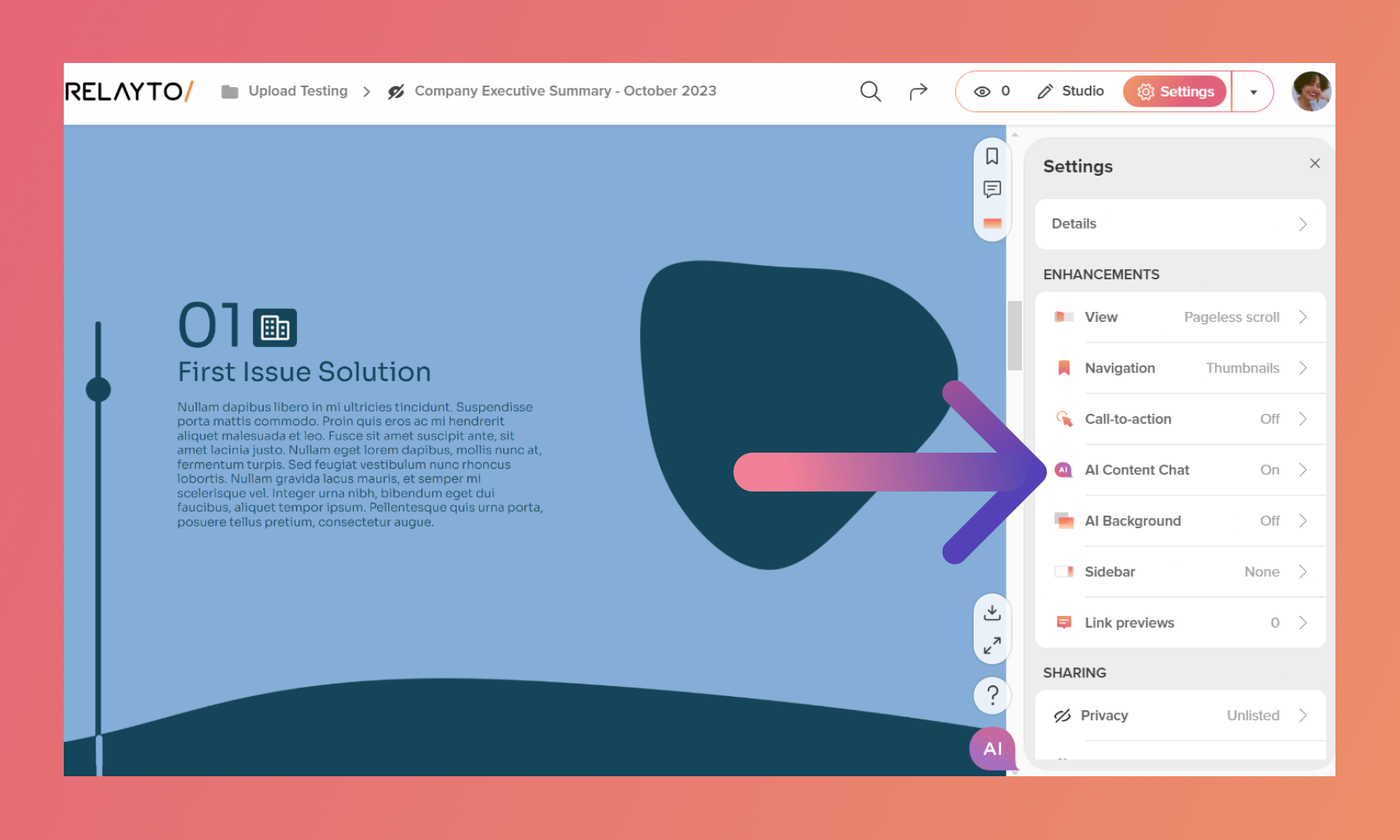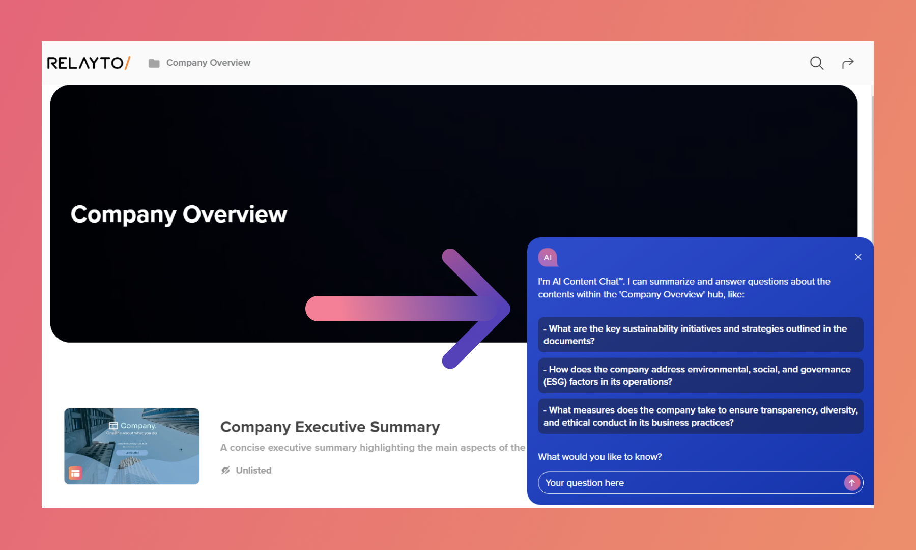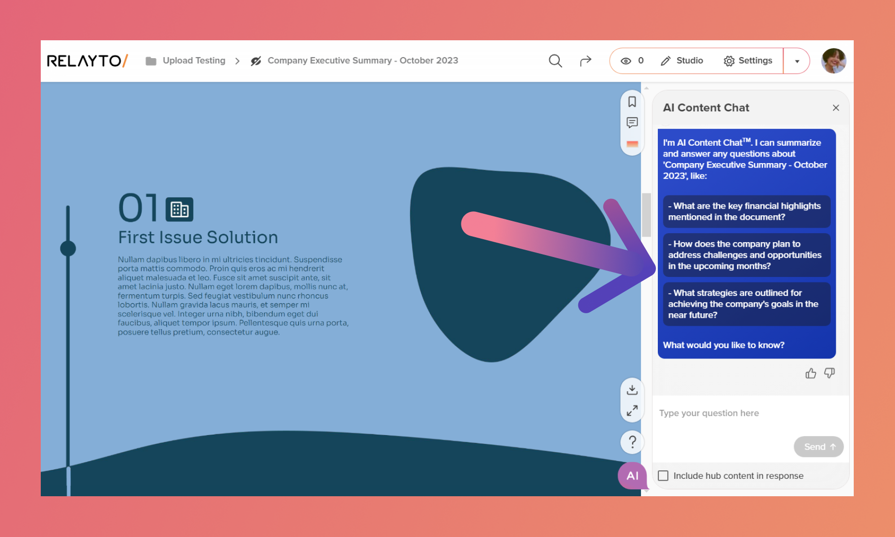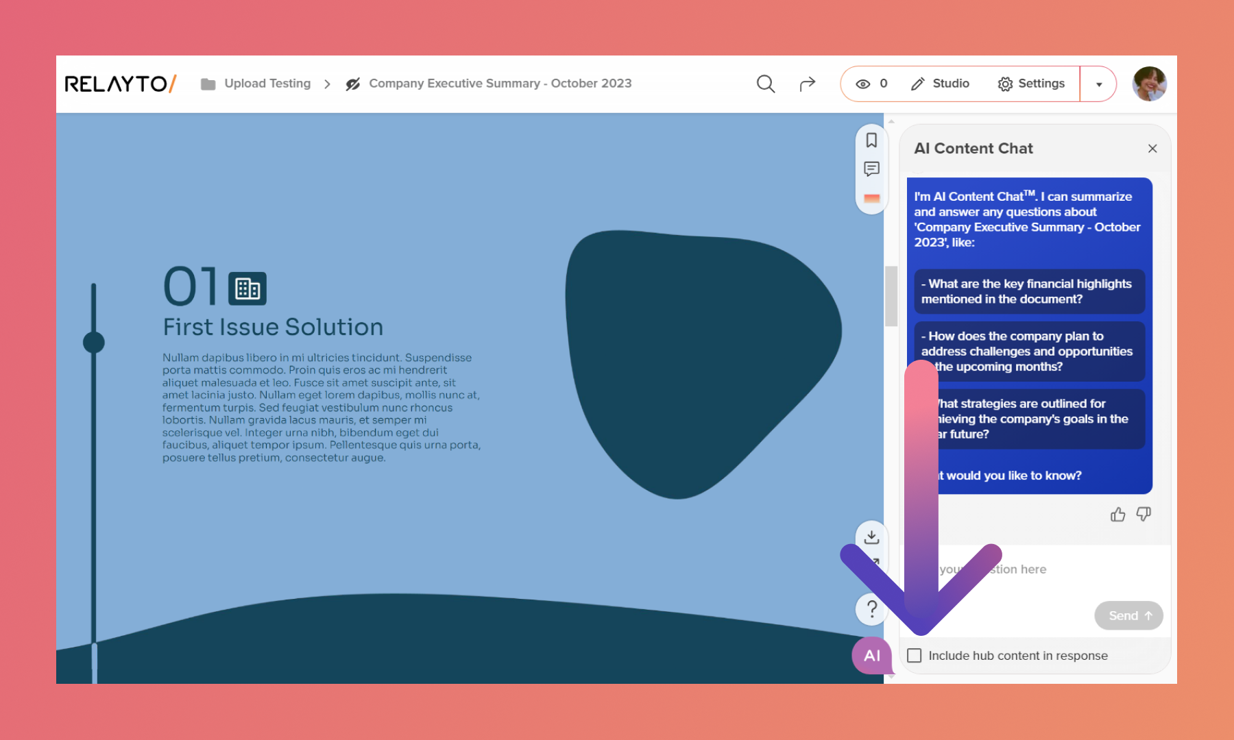 Open a digital experience or hub. The AI reads all content types in your workspace—PDFs, videos, images, audio, links, and more. To activate AI Chat, just open the content or hub you want it to reference.